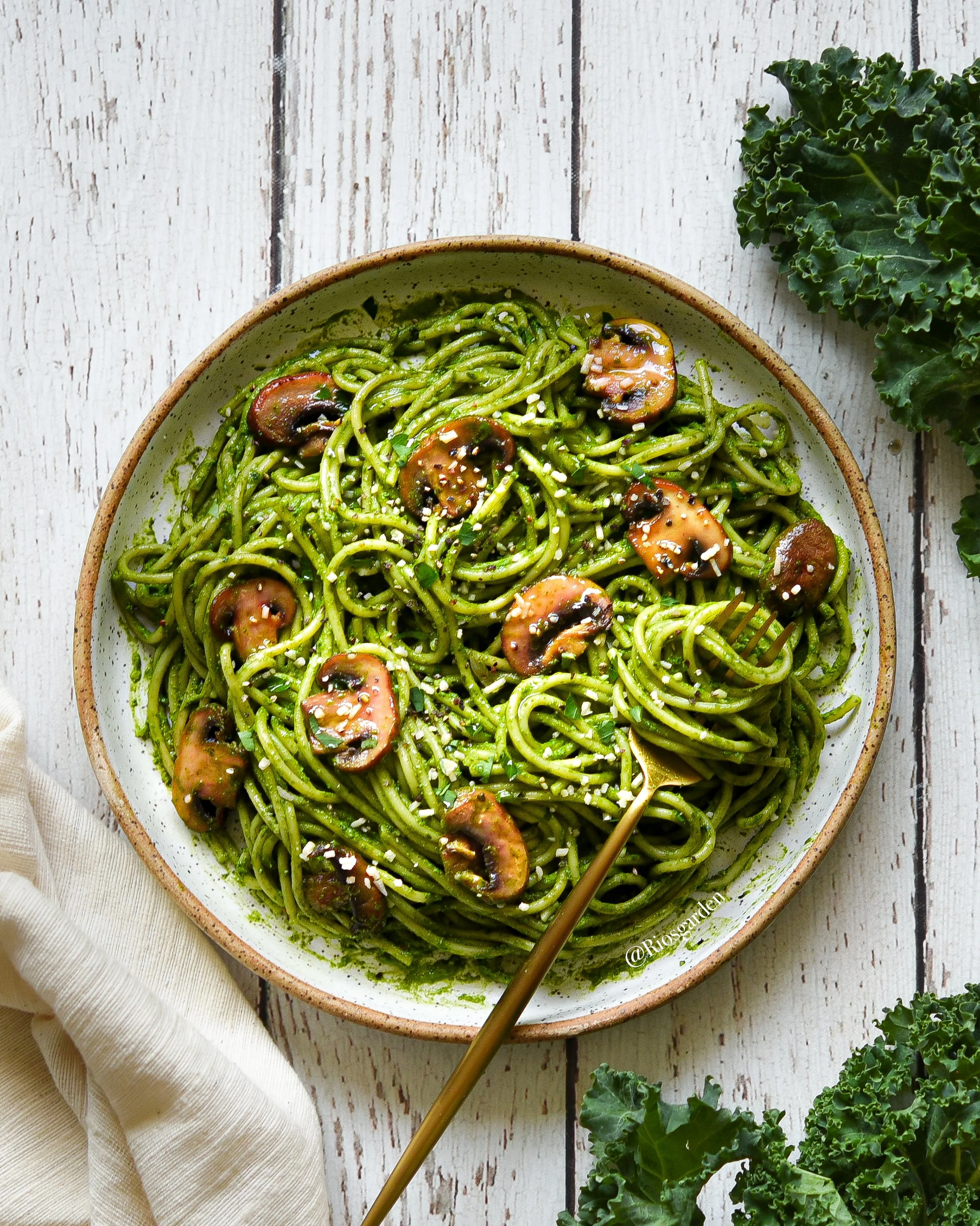 ケールは苦味やえぐみの少ないカーリーケールを選んで、トッピングのマッシュルームソテーもお忘れなく🍝💚